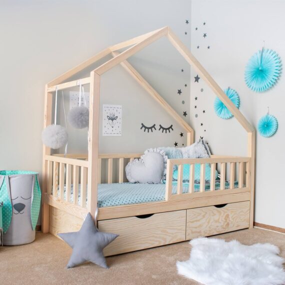 Łóżko domek Ciri z szufladą to wysokiej jakości łóżko w stylu skandynawskim -wykonane jest z pierwszej klasy kantówki sosnowej. To wspaniałe miejsce nie tylko dla snu ale i bezpiecznej zabawy dziecka