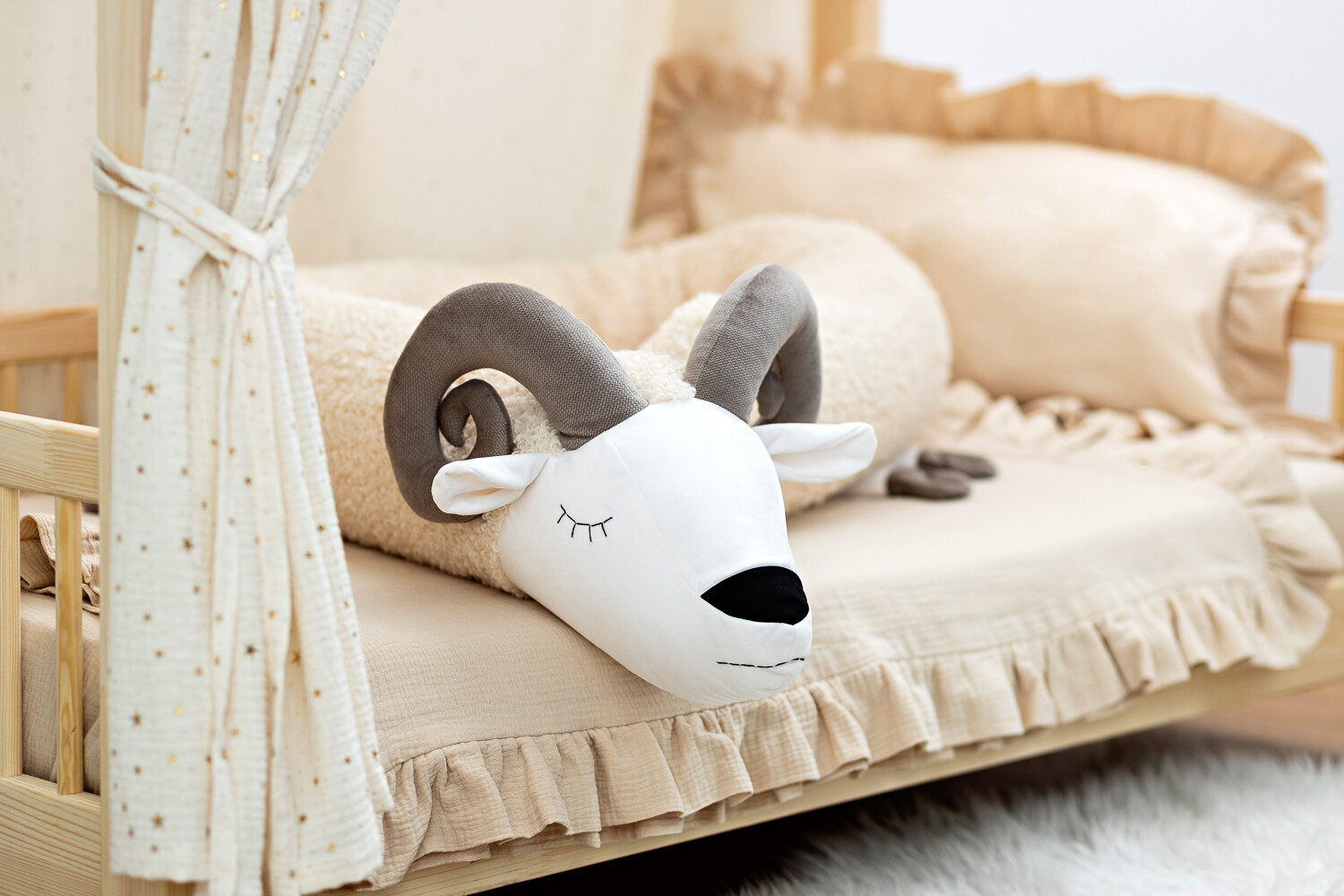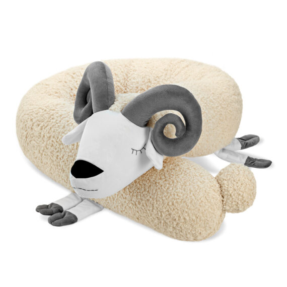 Urocza poduszka w kształcie baranka z zawiniętymi rogami to miękka przytulanka do snu i relaksu. Sprawdzi się idealnie zarówno w łóżeczku, jak i w kąciku zabaw. Naturalne kolory i łagodne kształty dodadzą wnętrzu ciepła i harmonii. Wykonana z bezpiecznych, certyfikowanych materiałów.