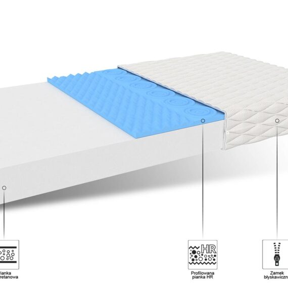 Ponadto zastosowana profilowana pianka HR, wyróżnia się niezwykłą trwałością i odpornością na odkształcenia. Dodatkowym atutem pianki jest jej porowata struktura, która zapewnia doskonałą cyrkulację powietrza, co uniemożliwia rozwój grzybów i pleśni.