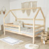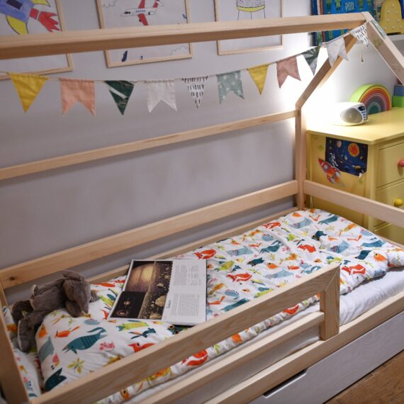 Łóżko domek Abi z szufladą to wysokiej jakości łóżko w stylu skandynawskim -wykonane jest z pierwszej klasy kantówki sosnowej o przekroju 5×5. To wspaniałe miejsce nie tylko dla snu ale i bezpiecznej zabawy dziecka