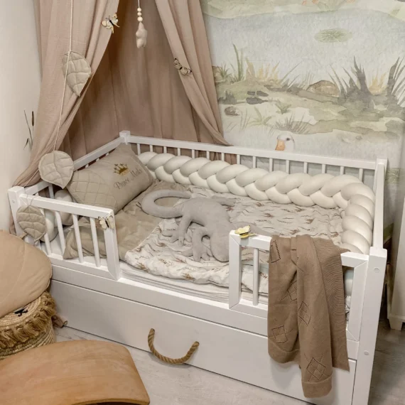 Za dodatkową opłatą w szufladzie może znajdować się stelaż pod kolejny materac – jako dodatkowe miejsce do spania. Dobierając materac na dodatkowe spanie należy uwzględnić, że musi być on krótszy 10 cm np: kupując łóżeczko rozmiar 160×80 w szufladzie z funkcją spania materac musi mieć wymiar 150×70