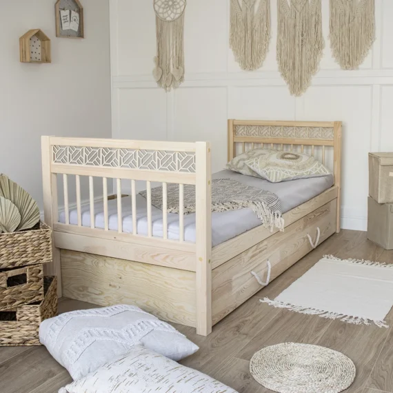 Łóżko Hanko II z szufladą to wysokiej jakości łóżko w stylu boho, wykonane z pierwszej klasy kantówki sosnowej.