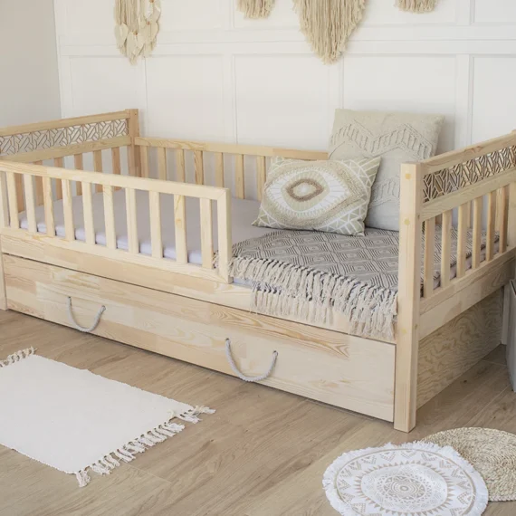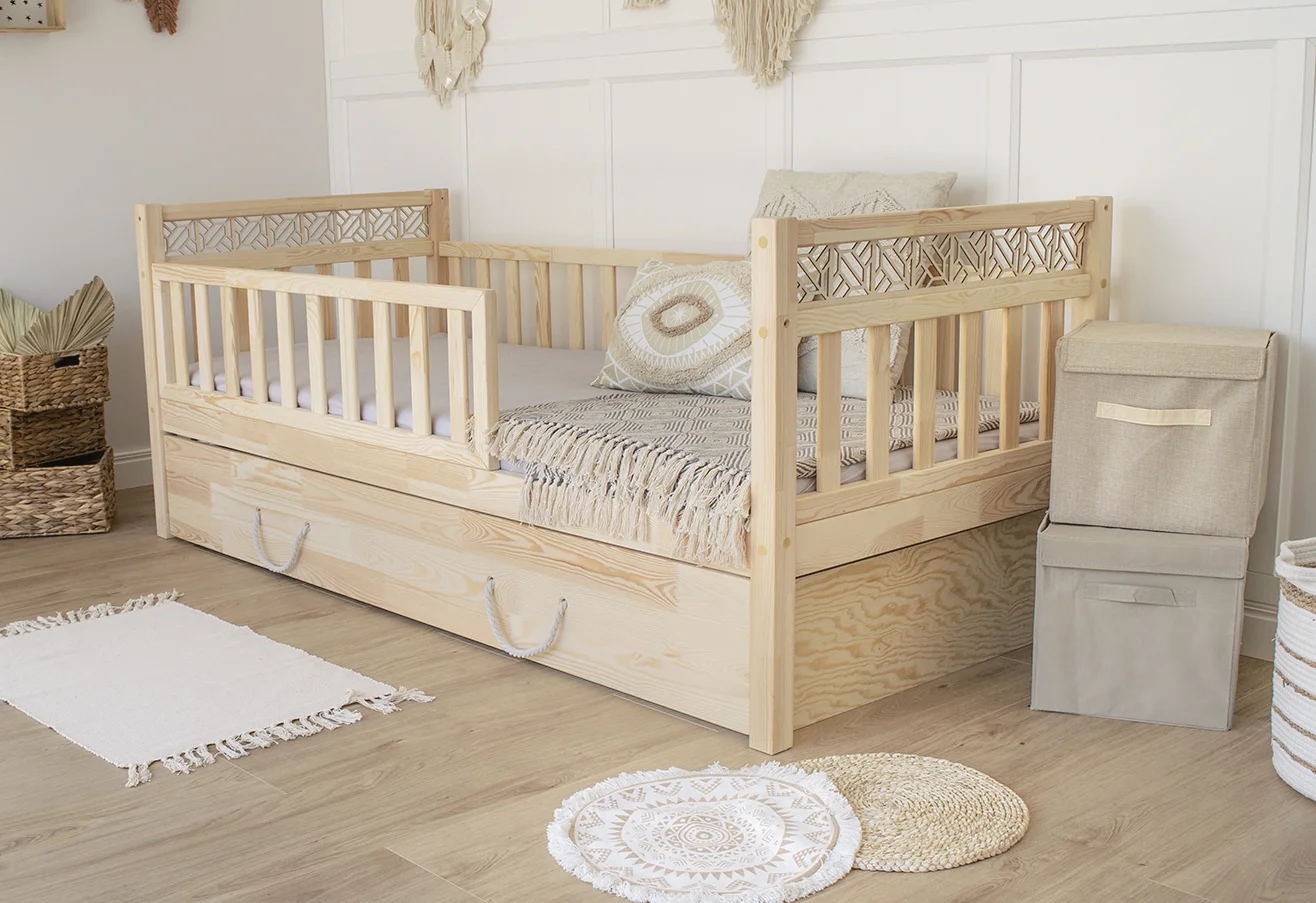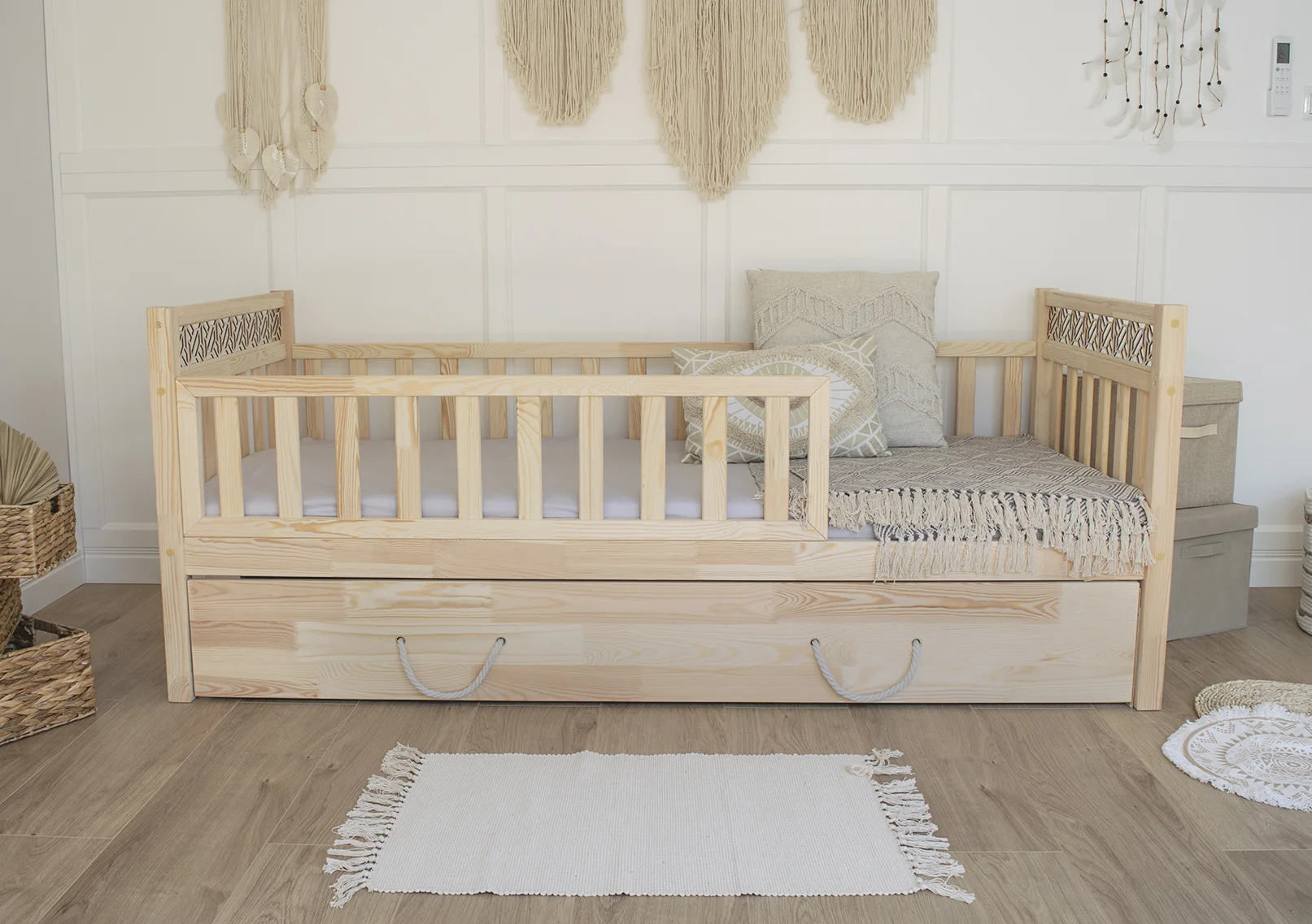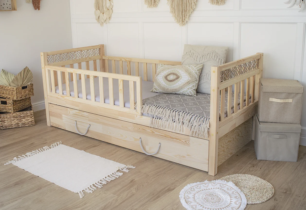 Łóżko Kira z szufladą to wysokiej jakości łóżko w stylu boho wykonane z pierwszej klasy kantówki sosnowej.