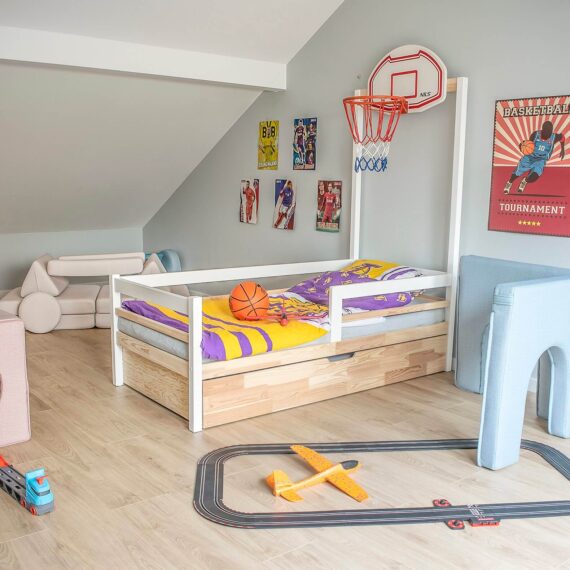 Łóżko koszykarskie wykonane jest z wysokiej jakości kantówki sosnowej. To wspaniałe miejsce nie tylko dla snu ale i bezpiecznej zabawy dziecka. Spełni wymagania każdego małego fana koszykówki i zachęci do kreatywnego spędzania czasu.