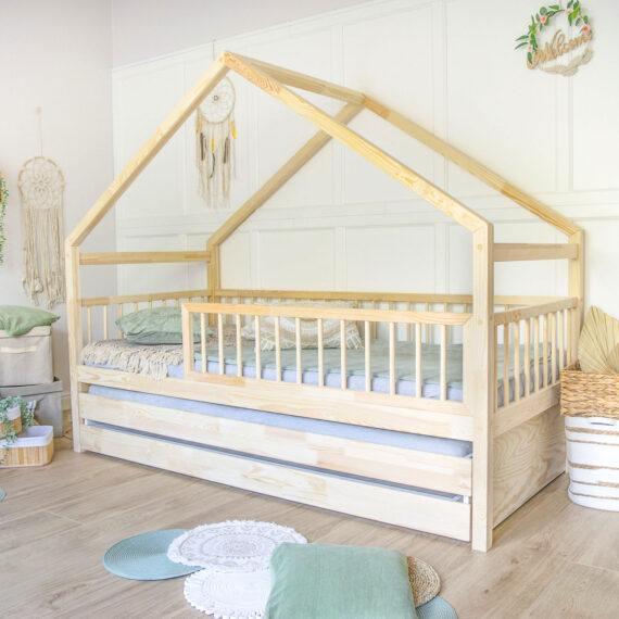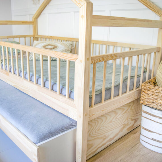 Łóżko domek Luna 3 w 1 z szufladą pełniącą funkcję spania + dodatkowa szuflada- to wysokiej jakości łóżko w stylu skandynawskim -wykonane jest z pierwszej klasy kantówki sosnowej. To wspaniałe miejsce nie tylko dla snu ale i bezpiecznej zabawy dziecka.