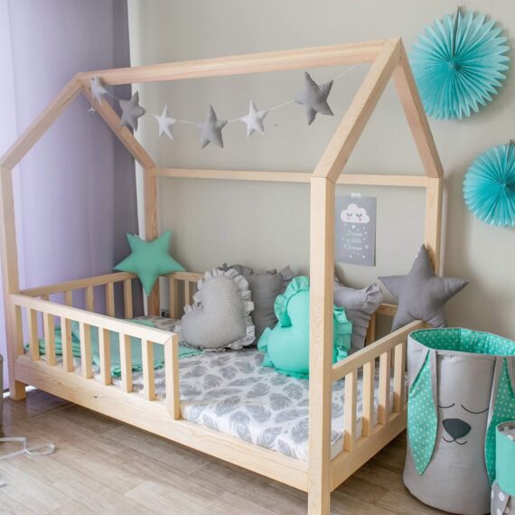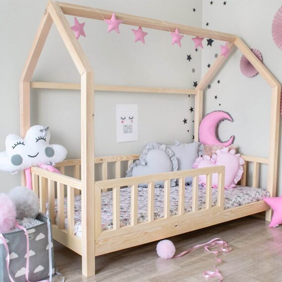 Łóżko domek Vienna bez szuflady to wysokiej jakości łóżko w stylu skandynawskim -wykonane jest z pierwszej klasy kantówki sosnowej o przekroju 5×5. To wspaniałe miejsce nie tylko dla snu ale i bezpiecznej zabawy dziecka