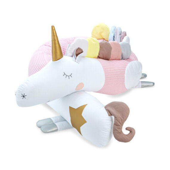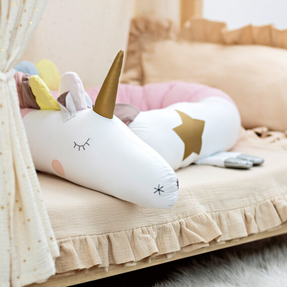 Poduszka do zasypiania w kształcie jednorożca – pudrowo-różowa magia snu. Ten różowy jednorożec to marzenie każdej małej księżniczki. Uszyty z mięciutkiej wafelkowej bawełny i wypełniony antyalergicznym puchem. Grzywa, nóżki i ogonek wykonane ręcznie z bajkową precyzją. To nie tylko ochraniacz do łóżeczka, ale też zaczarowana przytulanka!
