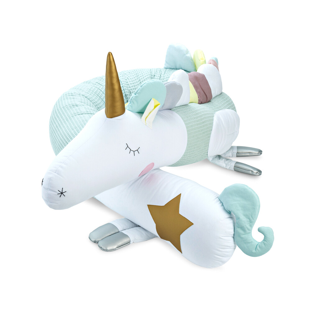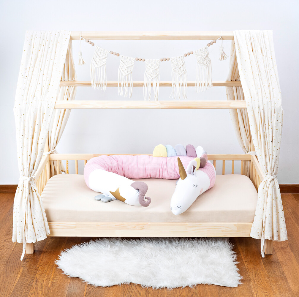 Poduszka do zasypiania w kształcie jednorożca – pudrowo-różowa magia snu. Ten różowy jednorożec to marzenie każdej małej księżniczki. Uszyty z mięciutkiej wafelkowej bawełny i wypełniony antyalergicznym puchem. Grzywa, nóżki i ogonek wykonane ręcznie z bajkową precyzją. To nie tylko ochraniacz do łóżeczka, ale też zaczarowana przytulanka!