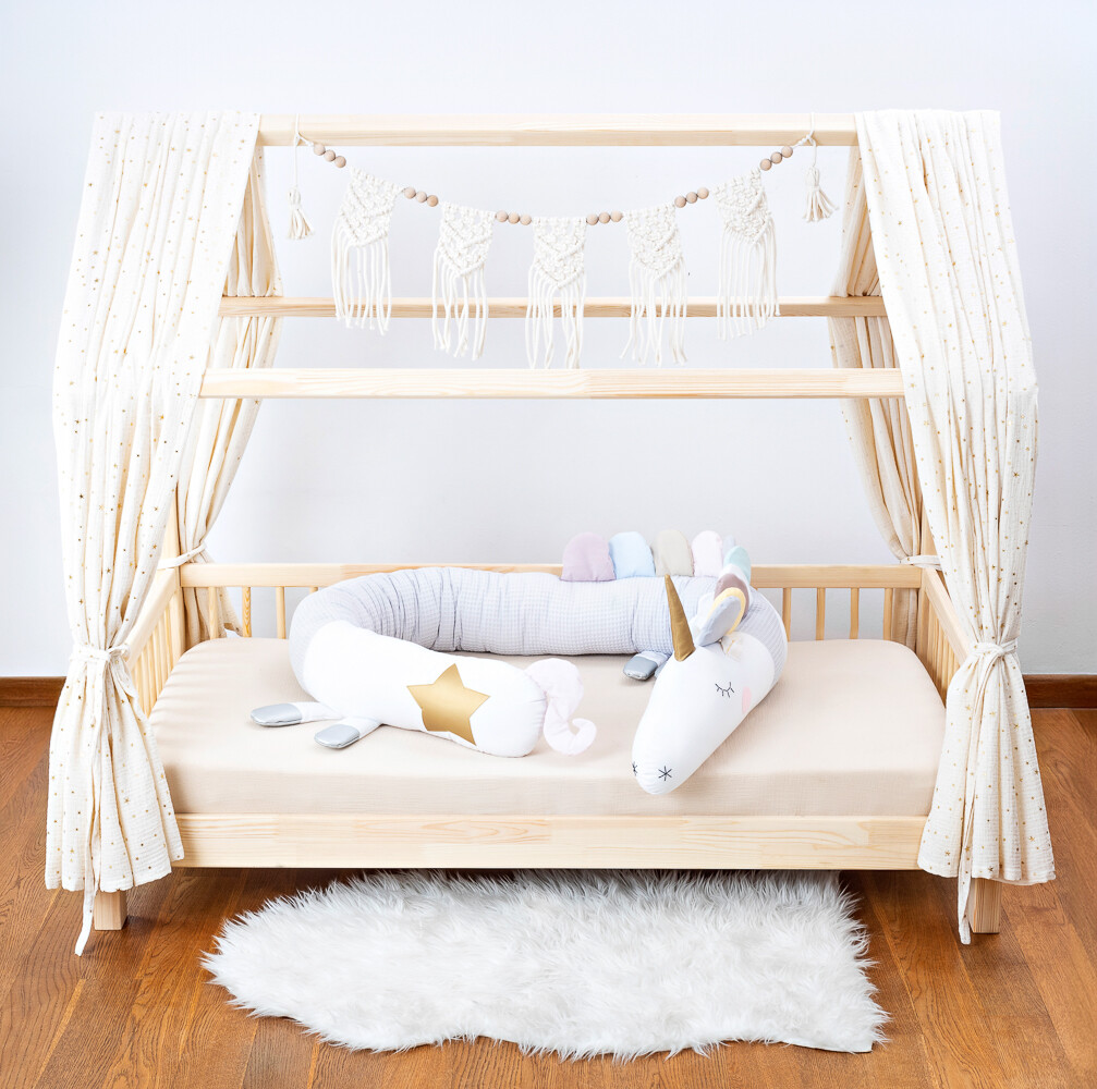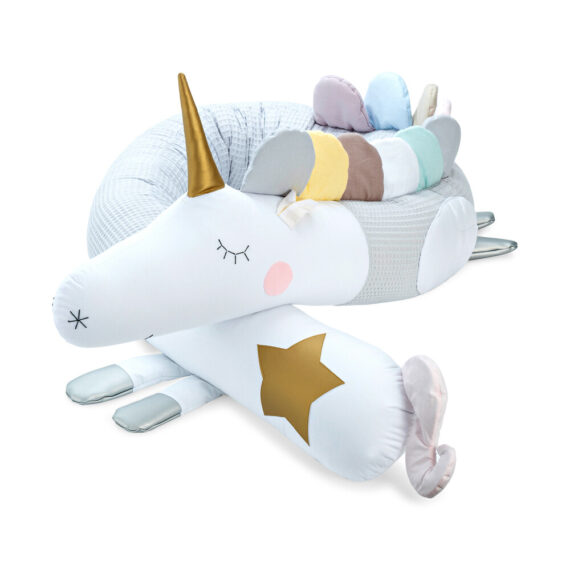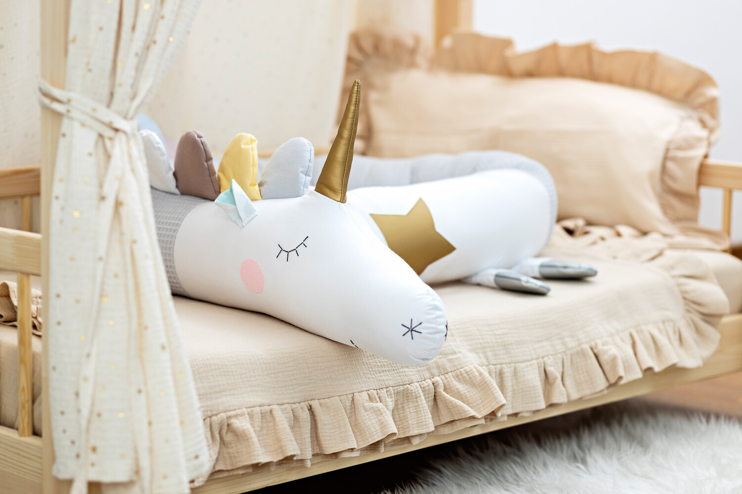 Poduszka wałeczek do spania – jednorożec w spokojnej szarości. Szary jednorożec z haftowanymi oczkami strzeże snów jak wierny strażnik. Delikatna bawełna wafelkowa i ręczne wykończenie dodają mu charakteru. Idealny jako ochraniacz, dekoracja i wyjątkowa poducha do tulenia. Stonowany kolor wprowadzi harmonię do każdego dziecięcego wnętrza.